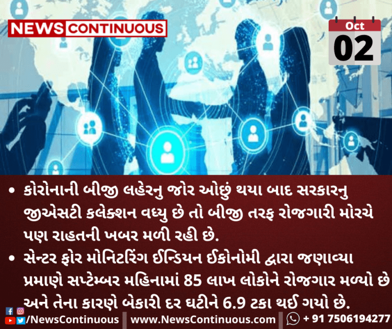 કોરોનાની બીજી લહેરનુ જોર ઓછું થયા બાદ સરકારનુ જીએસટી કલેક્શન વધ્યુ છે તો બીજી તરફ રોજગારી મોરચે પણ રાહતની ખબર મળી રહી છે.