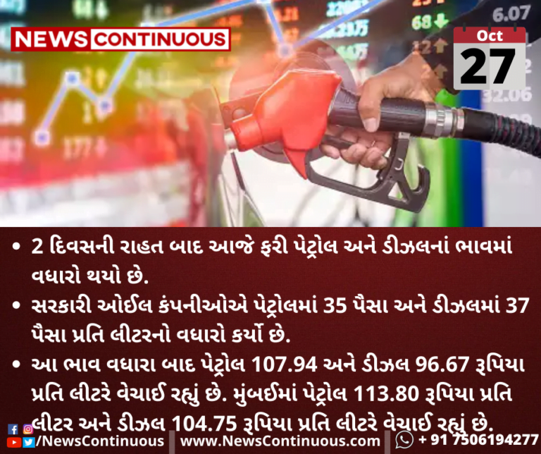 આ ભાવ વધારા બાદ પેટ્રોલ 107.94 અને ડીઝલ 96.67 રૂપિયા પ્રતિ લીટરે વેચાઈ રહ્યું છે.