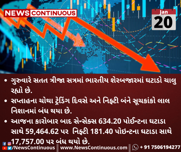 આજના કારોબાર બાદ સેન્સેક્સ 634.20 પોઈન્ટના ઘટાડા સાથે 59,464.62 પર તો નિફ્ટી 181.40 પોઇન્ટના ઘટાડા સાથે 17,757.00 પર બંધ થયો છે.