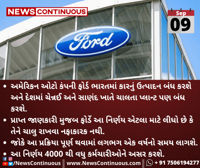 અમેરિકન ઓટો કંપની ફોર્ડ ભારતમાં કારનું ઉત્પાદન બંધ કરશે અને દેશમાં ચેન્નઈ અને સાણંદ ખાતે ચાલતા પ્લાન્ટ પણ બંધ કરશે.