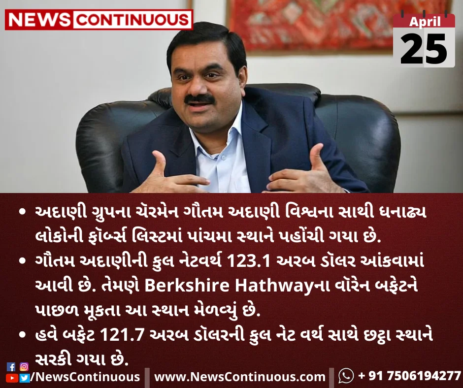 ગૌતમ અદાણીની કુલ નેટવર્થ(networth) 123.1 અરબ ડૉલર આંકવામાં આવી છે. તેમણે Berkshire Hathwayના વૉરેન બફેટને(Warren Buffett) પાછળ મૂકતા આ સ્થાન મેળવ્યું છે.