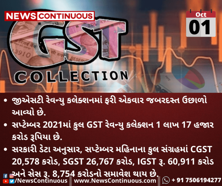 સપ્ટેમ્બર 2021માં કુલ GST રેવન્યુ કલેક્શન 1 લાખ 17 હજાર કરોડ રૂપિયા છે.