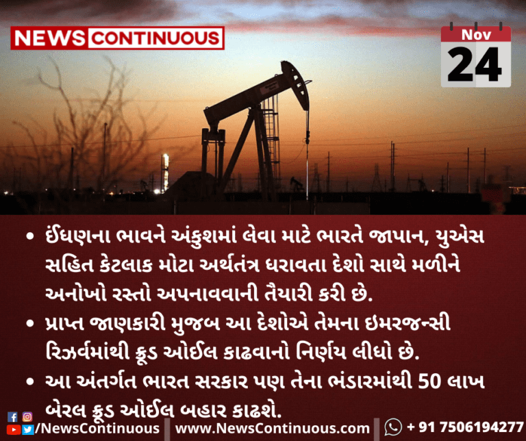 આ અંતર્ગત ભારત સરકાર પણ તેના ભંડારમાંથી 50 લાખ બેરલ ક્રૂડ ઓઈલ બહાર કાઢશે.