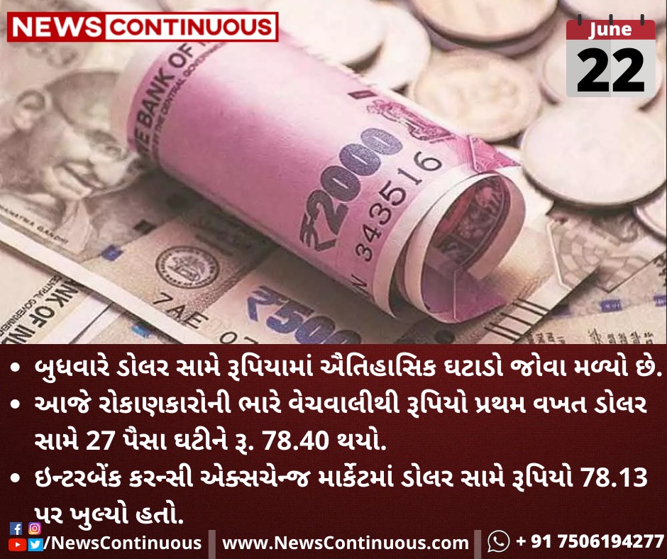 આજે રોકાણકારોની(investors) ભારે વેચવાલીથી રૂપિયો પ્રથમ વખત ડોલર સામે 27 પૈસા ઘટીને રૂ. 78.40 થયો.