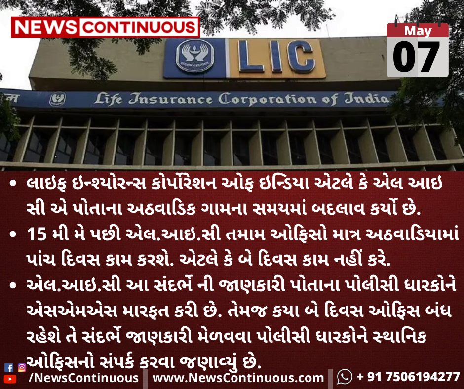 15 મી મે પછી એલ.આઇ.સી તમામ ઓફિસો માત્ર અઠવાડિયામાં પાંચ દિવસ કામ કરશે. એટલે કે બે દિવસ કામ નહીં કરે.