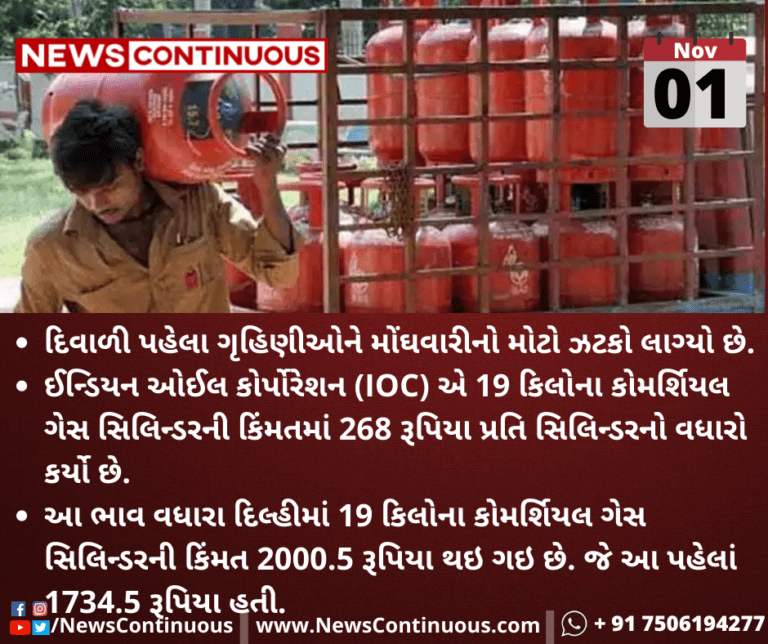 ઈન્ડિયન ઓઈલ કોર્પોરેશન (IOC) એ 19 કિલોના કોમર્શિયલ ગેસ સિલિન્ડરની કિંમતમાં 268 રૂપિયા પ્રતિ સિલિન્ડરનો વધારો કર્યો છે.