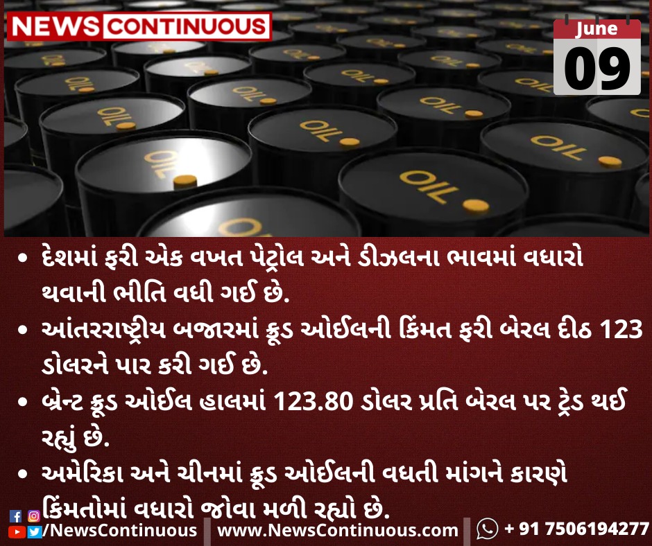 બ્રેન્ટ ક્રૂડ ઓઈલ(Brent crude oil) હાલમાં 123.80 ડોલર પ્રતિ બેરલ પર ટ્રેડ(Trade) થઈ રહ્યું છે.