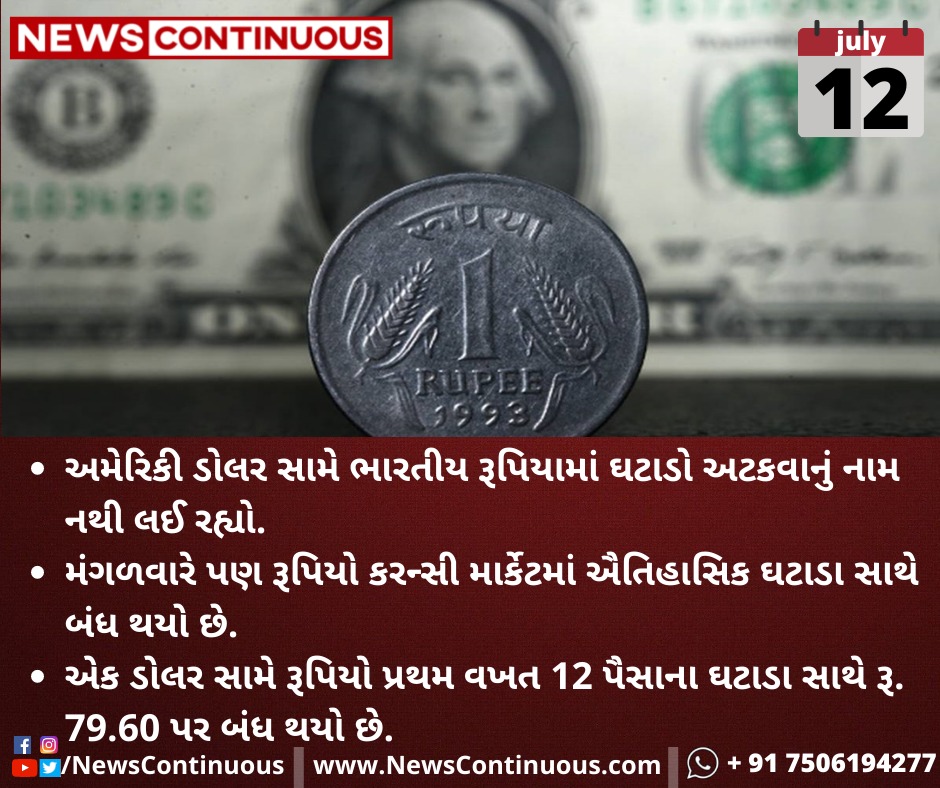 એક ડોલર સામે રૂપિયો પ્રથમ વખત 12 પૈસાના ઘટાડા સાથે રૂ. 79.60 પર બંધ થયો છે.