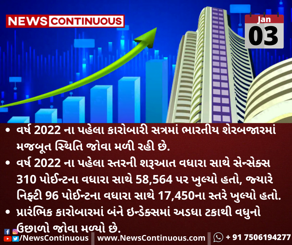 વર્ષ 2022 ના પહેલા સ્તરની શરૂઆત વધારા સાથે સેન્સેક્સ 310 પોઈન્ટના વધારા સાથે 58,564 પર ખુલ્યો હતો, જ્યારે નિફ્ટી 96 પોઈન્ટના વધારા સાથે 17,450ના સ્તરે ખુલ્યો હતો.