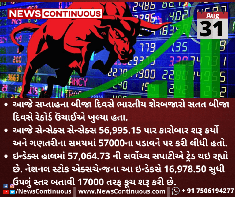 આજે સેન્સેક્સ સેન્સેક્સ 56,995.15 પાર કારોબાર શરૂ કર્યો અને ગણતરીના સમયમાં 57000ના પડાવને પર કરી લીધી હતો.