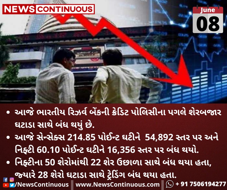 આજે સેન્સેક્સ(Sensex) 214.85 પોઈન્ટ ઘટીને 54,892 સ્તર પર અને નિફ્ટી(Nifty) 60.10 પોઈન્ટ ઘટીને 16,356 સ્તર પર બંધ થયો.