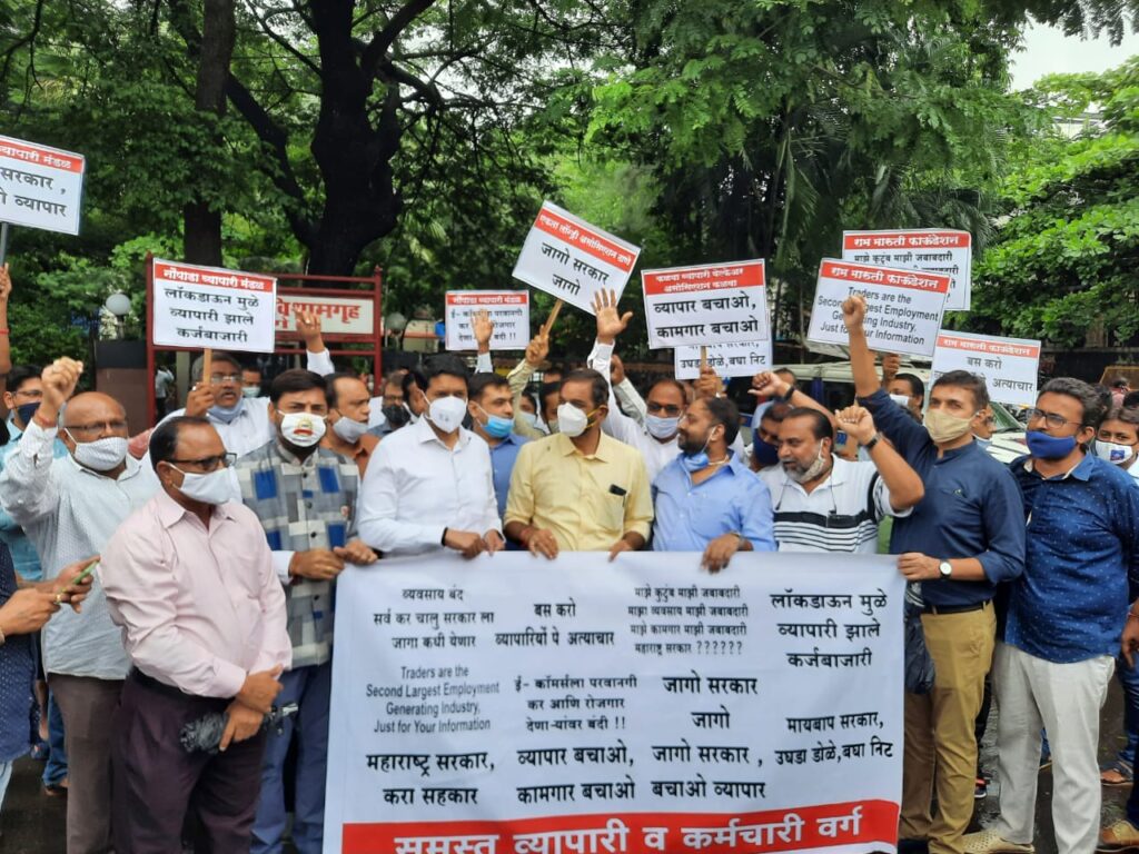કોરોનાને પગલે લાદવામાં આવેલા પ્રતિબંધો હટાવવાની વેપારીઓ સતત માગણી કરી રહ્યા છે. તેમની માગણી તરફ સતત દુર્લક્ષ કરવામાં આવી રહ્યું છે. એથી વેપારી વર્ગમાં ભારે નારાજગી જોવા મળી રહી છે ત્યારે ગુરુવારે સવારે “હવે તો સરકાર જાગે, પોતાની આંખો ખોલે” એવા હૉર્ડિંગ્સ સાથે થાણેમાં કલેક્ટર ઑફિસની બહાર મોટી સંખ્યામાં થાણેના વેપારીઓએ વિરોધ પ્રદર્શન કર્યાં હતાં.