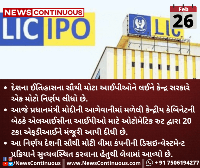 આજે પ્રધાનમંત્રી મોદીની આગેવાનીમાં મળેલી કેન્દ્રીય કેબિનેટની બેઠકે એલઆઈસીના આઈપીઓ માટે ઓટોમેટિક રુટ દ્વારા 20 ટકા એફડીઆઈને મંજૂરી આપી દીધી છે.