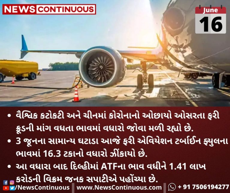 3 જૂનના સામાન્ય ઘટાડા આજે ફરી એવિયેશન ટર્બાઈન ફ્યુલના(Aviation turbine fuel) ભાવમાં 16.3 ટકાનો વધારો ઝીંકાયો છે.