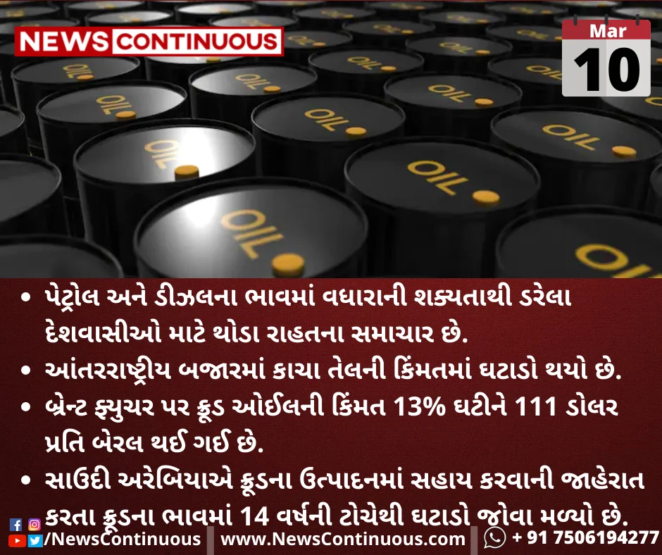 બ્રેન્ટ ફ્યુચર પર ક્રૂડ ઓઈલની કિંમત 13 ટકા ઘટીને 111 ડોલર પ્રતિ બેરલ થઈ ગઈ છે.