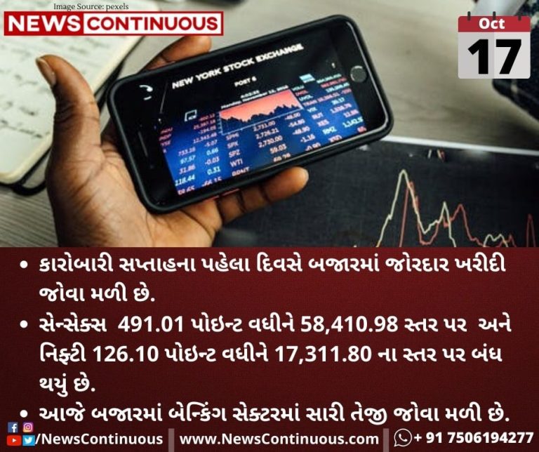 સેન્સેક્સ(Sensex) 491.01 પોઇન્ટ વધીને 58,410.98 સ્તર પર અને નિફ્ટી(Nifty) 126.10 પોઇન્ટ વધીને 17,311.80 ના સ્તર પર બંધ થયું છે.