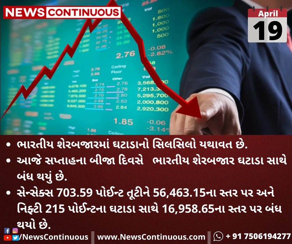 સેન્સેક્સ(Sensex) 703.59 પોઈન્ટ તૂટીને 56,463.15ના સ્તર પર અને નિફ્ટી(Nifty) 215 પોઈન્ટના ઘટાડા સાથે 16,958.65ના સ્તર પર બંધ થયો છે.