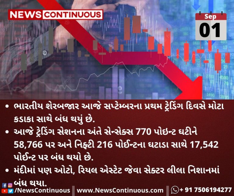 ભારતીય શેરબજાર(Indian stock market) આજે સપ્ટેમ્બરના પ્રથમ ટ્રેડિંગ દિવસે(trading day) મોટા કડાકા સાથે બંધ થયું છે.