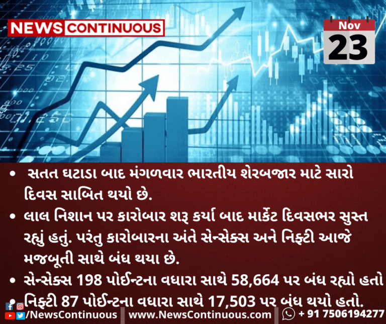 સેન્સેક્સ 198 પોઈન્ટના વધારા સાથે 58,664 પર બંધ રહ્યો હતો જ્યારે નિફ્ટી 87 પોઈન્ટના વધારા સાથે 17,503 પર બંધ થયો હતો.