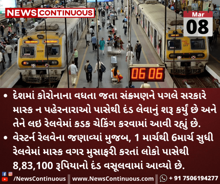 વેસ્ટર્ન રેલવેના જણાવ્યાં મુજબ, 1 માર્ચથી 6માર્ચ સુધી રેલવેમાં માસ્ક વગર મુસાફરી કરતાં લોકો પાસેથી 8,83,100 રૂપિયાનો દંડ વસૂલવામાં આવ્યો છે.