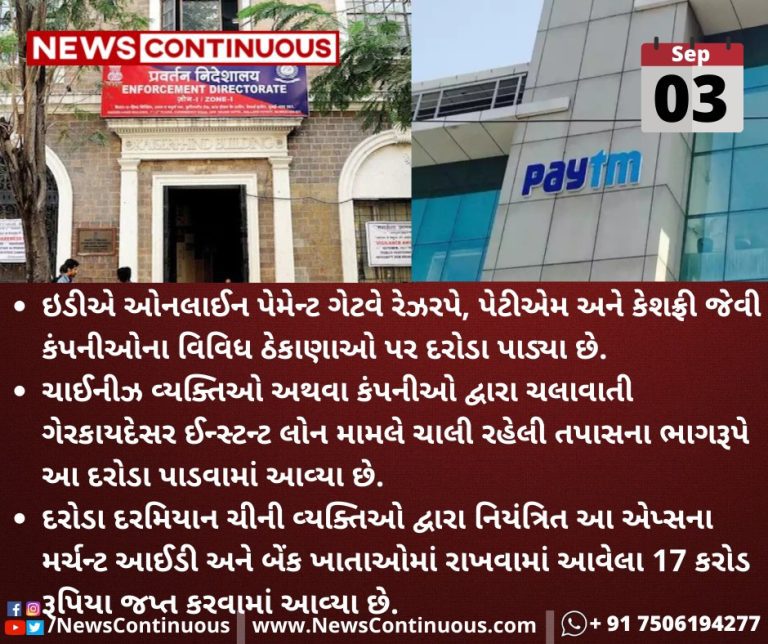 ઇડી(ED) એ ઓનલાઈન પેમેન્ટ ગેટવે રેઝરપે(Razorpay), પેટીએમ(Paytm) અને કેશફ્રી (Cashfree) જેવી કંપનીઓના વિવિધ ઠેકાણાઓ પર દરોડા(Raid) પાડ્યા છે.