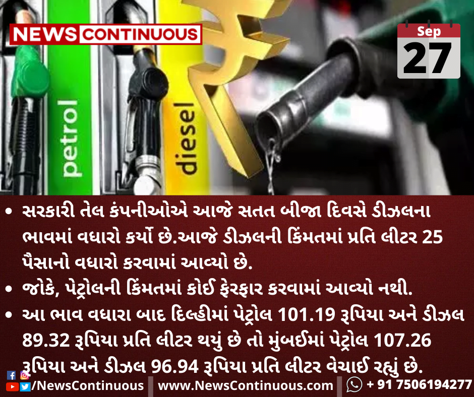 આજે ડીઝલની કિંમતમાં પ્રતિ લીટર 25 પૈસાનો વધારો કરવામાં આવ્યો છે. જોકે, પેટ્રોલની કિંમતમાં કોઈ ફેરફાર કરવામાં આવ્યો નથી.