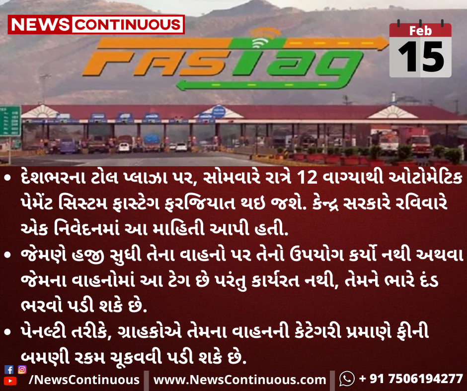 દેશભરના ટોલ પ્લાઝા પર, સોમવારે રાત્રે 12 વાગ્યાથી ઓટોમેટિક પેમેંટ સિસ્ટમ ફાસ્ટેગ ફરજિયાત થઇ જશે. કેન્દ્ર સરકારે રવિવારે એક નિવેદનમાં આ માહિતી આપી હતી.