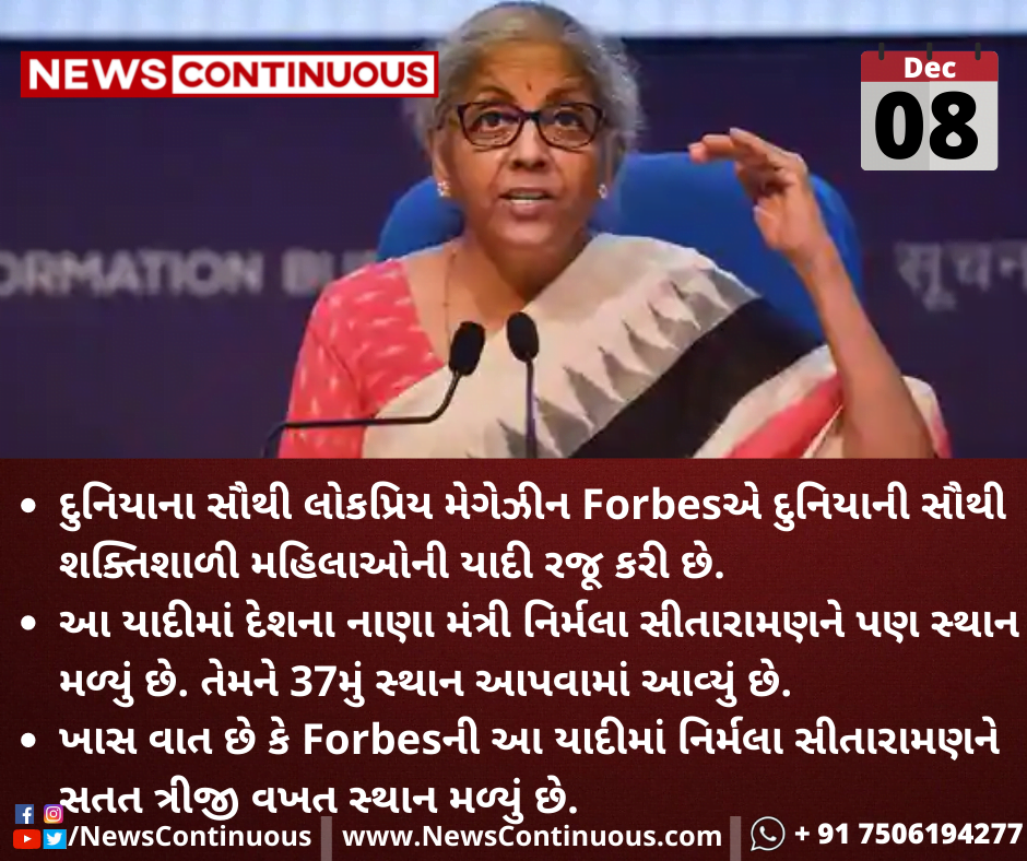 ખાસ વાત છે કે Forbesમાં નિર્મલા સીતારામણને સતત ત્રીજી વખત દુનિયાની 100 સૌથી શક્તિશાળી મહિલાઓની યાદીમાં સ્થાન મળ્યું છે.