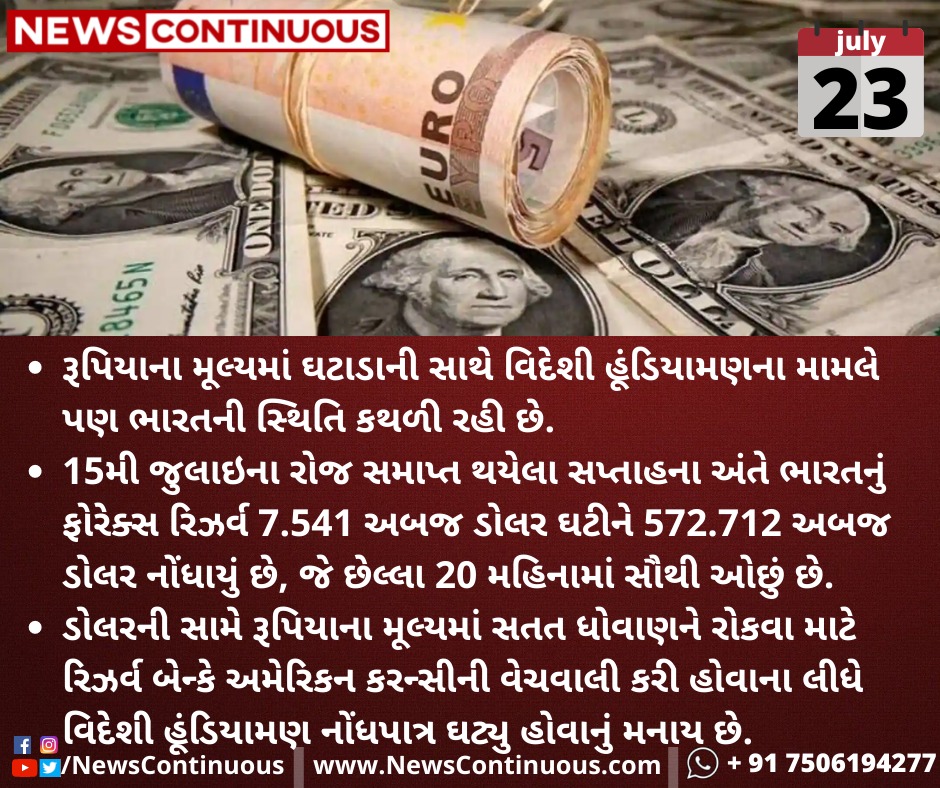 15મી જુલાઇના રોજ સમાપ્ત થયેલા સપ્તાહના અંતે ભારતનું ફોરેક્સ રિઝર્વ (Forex Reserve) 7.541 અબજ ડોલર(Billion dollar) ઘટીને 572.712 અબજ ડોલર નોંધાયું છે, જે છેલ્લા 20 મહિનામાં સૌથી ઓછું છે.