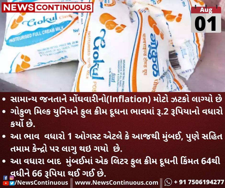ગોકુળ મિલ્ક યુનિયને(Gokul Milk Union) ફુલ ક્રીમ દૂધના ભાવમાં(full cream milk price) રૂ.2 રૂપિયાનો વધારો કર્યો છે.