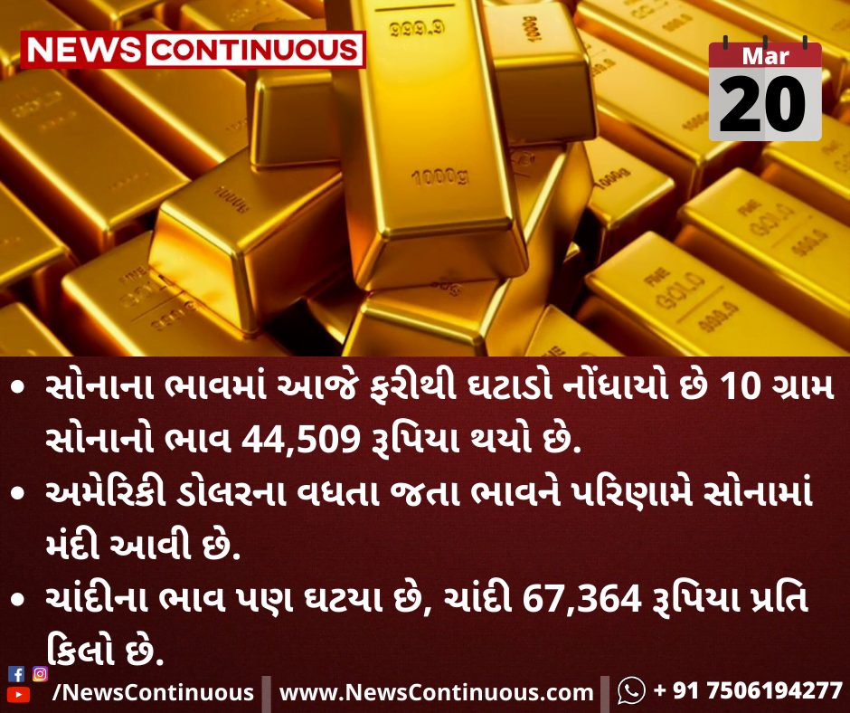 સોનાના ભાવમાં આજે ફરીથી ઘટાડો નોંધાયો છે 10 ગ્રામ સોનાનો ભાવ 44,509 રૂપિયા થયો છે.