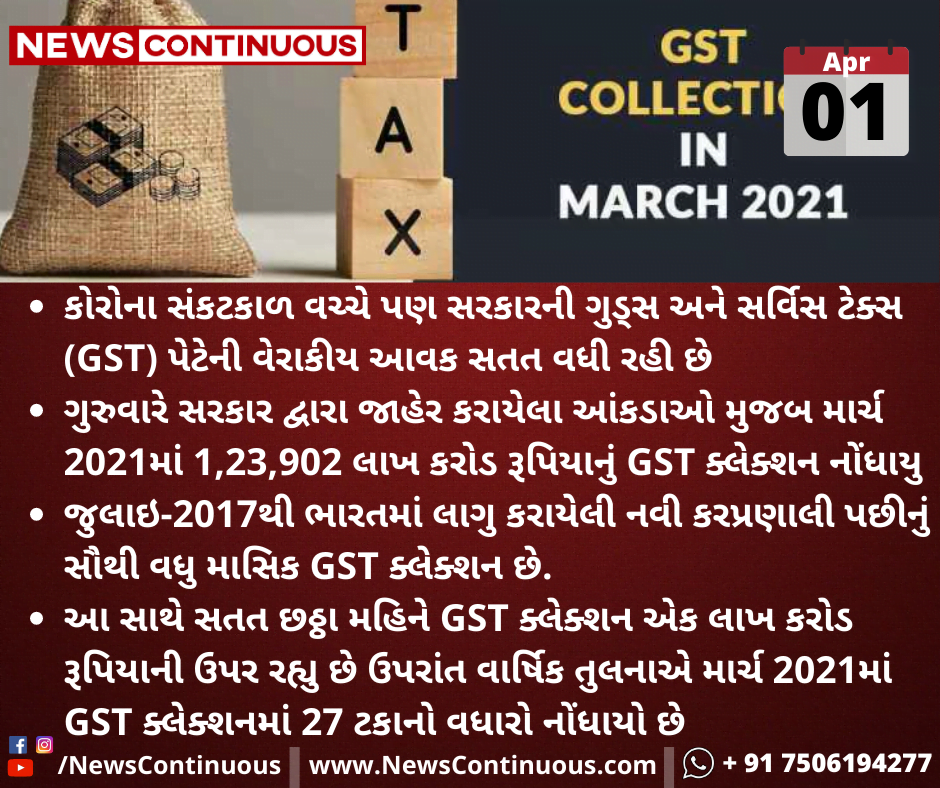 - ગુરુવારે સરકાર દ્વારા જાહેર કરાયેલા આંકડાઓ મુજબ માર્ચ 2021માં 1,23,902 લાખ કરોડ રૂપિયાનું GST ક્લેક્શન નોંધાયુ