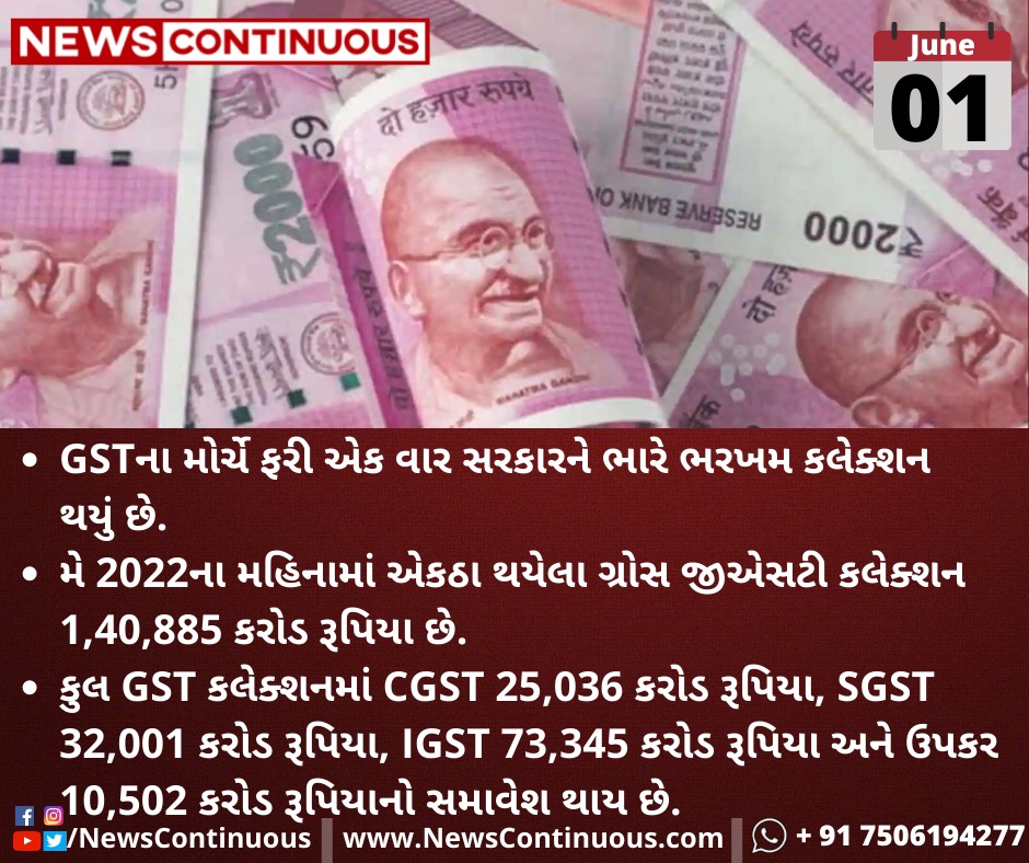 મે 2022ના મહિનામાં એકઠા થયેલા ગ્રોસ જીએસટી(Gross GST) કલેક્શન 1,40,885 કરોડ રૂપિયા છે.