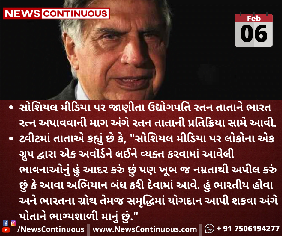 - સોશિયલ મીડિયા પર જાણીતા ઉદ્યોગપતિ રતન તાતાને ભારત રત્ન અપાવવાની માગ અંગે રતન તાતાની પ્રતિક્રિયા સામે આવી.