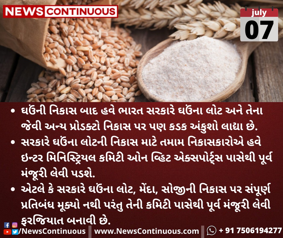 એટલે કે સરકારે ઘઉંના લોટ, મેંદા(Maida), સોજીની નિકાસ(Semolina) પર સંપૂર્ણ પ્રતિબંધ મૂક્યો નથી પરંતુ તેની કમિટી પાસેથી પૂર્વ મંજૂરી લેવી ફરજિયાત બનાવી છે.