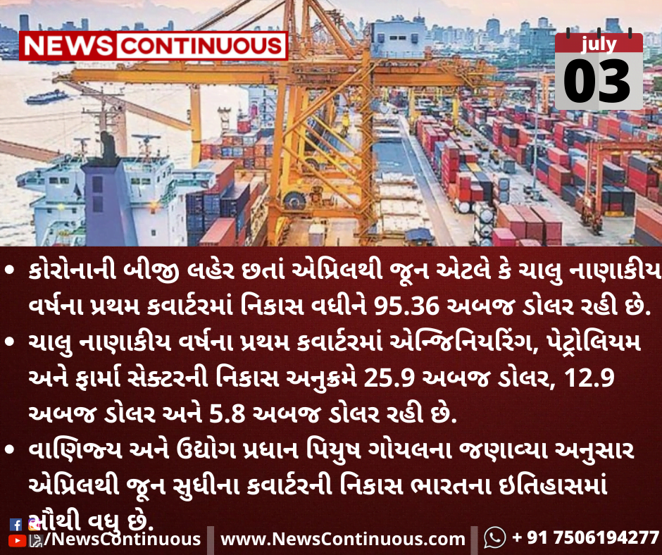 કોરોનાની બીજી લહેર છતાં એપ્રિલથી જૂન એટલે કે ચાલુ નાણાકીય વર્ષના પ્રથમ કવાર્ટરમાં નિકાસ વધીને 95.36 અબજ ડોલર રહી છે.
