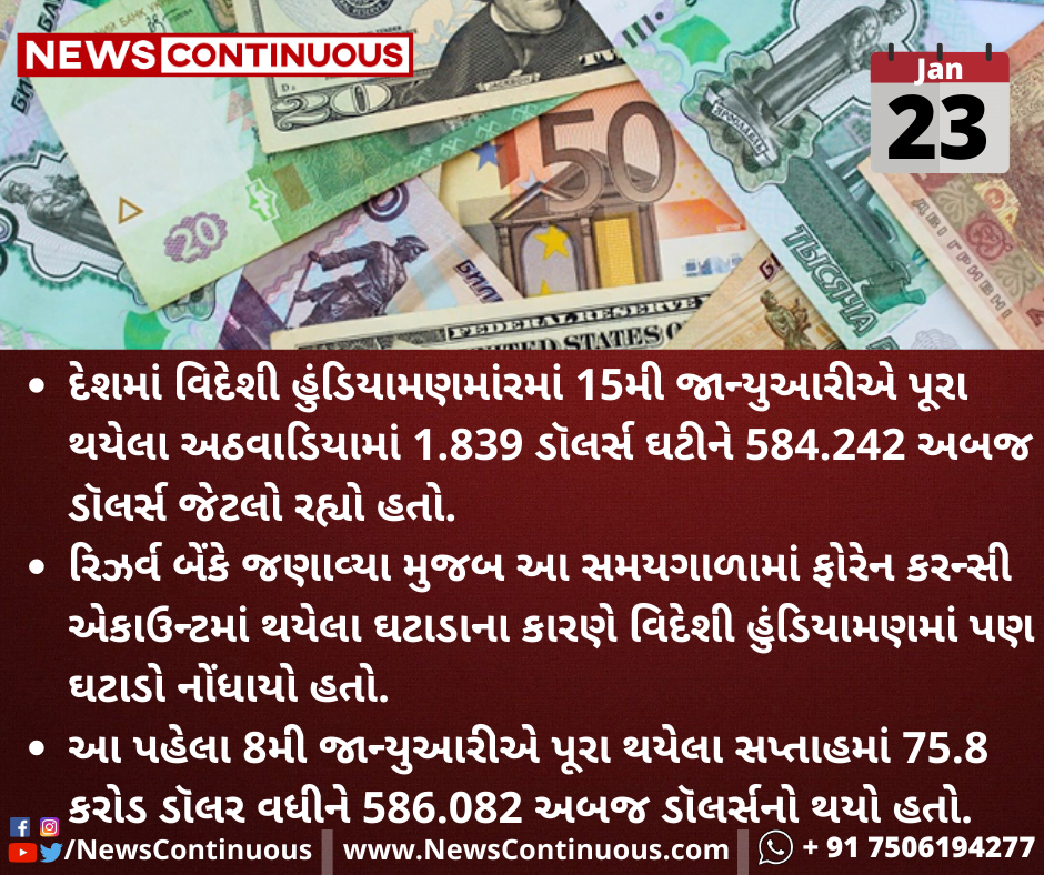 દેશમાં વિદેશી મુદ્રા ભંડારમાં 15મી જાન્યુઆરીએ પૂરા થયેલા અઠવાડિયામાં 1.839 ડૉલર્સ ઘટીને 584.242 અબજ ડૉલર્સ જેટલો રહ્યો હતો.