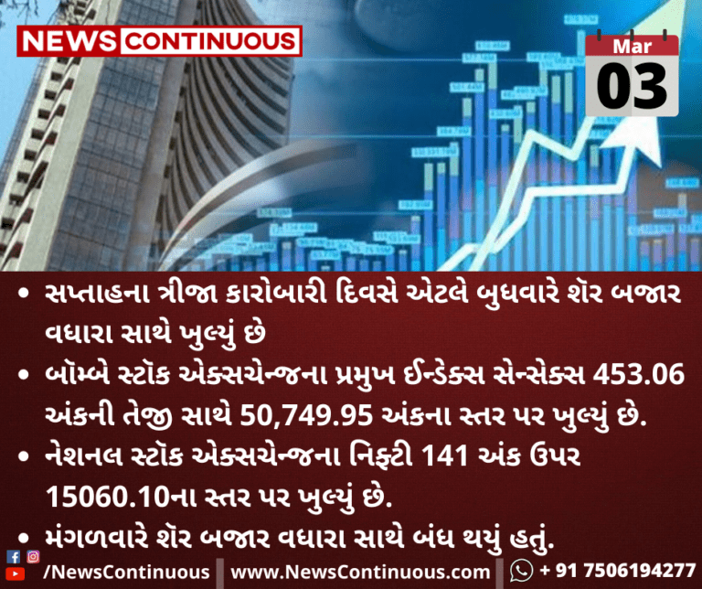 બૉમ્બે સ્ટૉક એક્સચેન્જના પ્રમુખ ઈન્ડેક્સ સેન્સેક્સ 453.06 અંકની તેજી સાથે 50,749.95 અંકના સ્તર પર ખુલ્યું છે. તેમ જ નેશનલ સ્ટૉક એક્સચેન્જના નિફ્ટી 141 અંક ઉપર 15060.10ના સ્તર પર ખુલ્યું છે.
