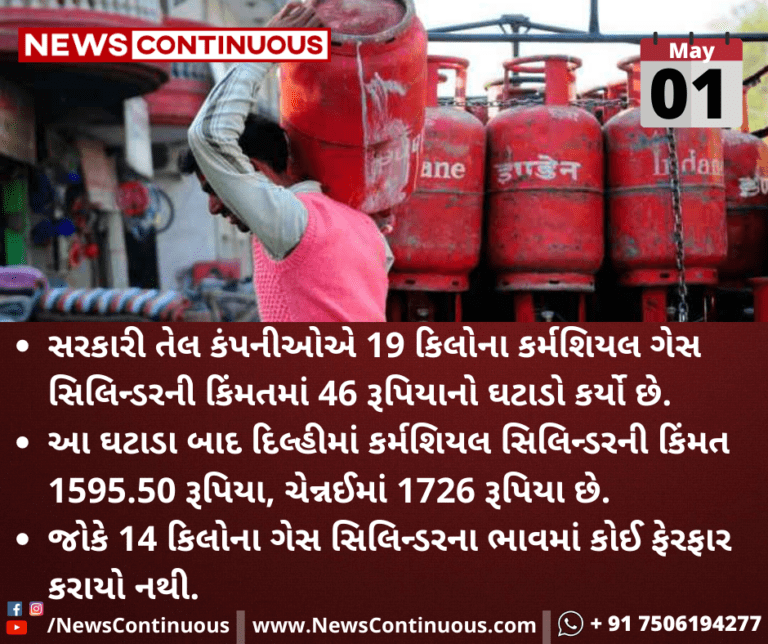 સરકારી તેલ કંપનીઓએ 19 કિલોના કર્મશિયલ ગેસ સિલિન્ડરની કિંમતમાં 46 રૂપિયાનો ઘટાડો કર્યો છે.