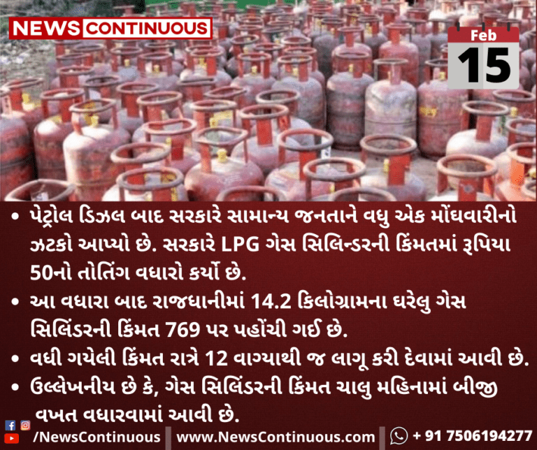 સરકારે LPG ગેસ સિલિન્ડરની કિંમતમાં રૂપિયા 50નો તોતિંગ વધારો કર્યો છે.