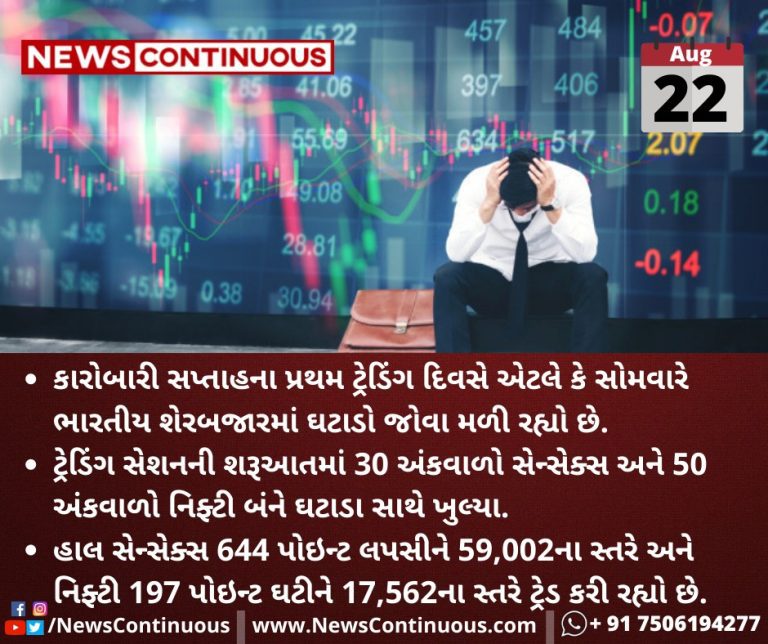 હાલ સેન્સેક્સ 643.82 પોઇન્ટ લપસીને 59,002.33ના સ્તરે અને નિફ્ટી 196.65 પોઇન્ટ ઘટીને 17,561.80ના સ્તરે ટ્રેડ કરી રહ્યો છે.