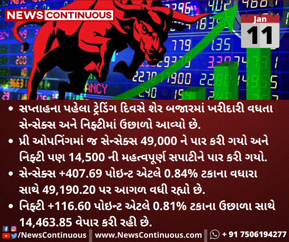 પ્રી ઓપનિંગમાં જ સેન્સેક્સ 49,000 ને પાર કરી ગયો છે અને નિફ્ટી પણ 14,500 ની મહત્વપૂર્ણ સપાટીને પાર કરી ગયો છે.