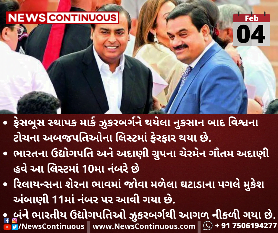 ફેસબૂસ સ્થાપક માર્ક ઝુકરબર્ગને થયેલા નુકસાન બાદ વિશ્વના ટોચના અબજપતિઓના લિસ્ટમાં ફેરફાર થયા છે.