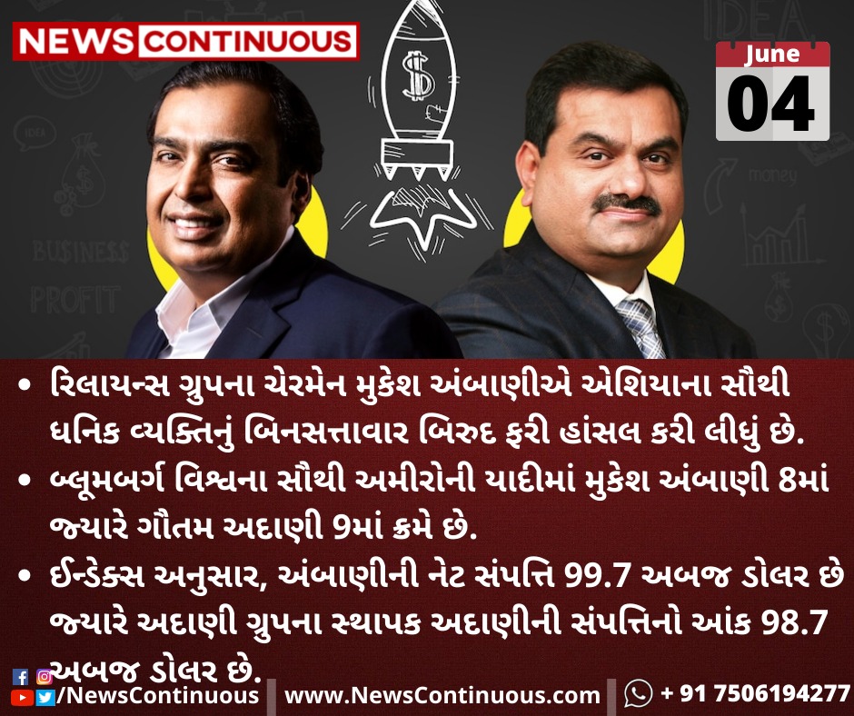 ઈન્ડેક્સ અનુસાર, અંબાણીની નેટ સંપત્તિ 99.7 અબજ ડોલર છે જ્યારે અદાણી ગ્રુપના સ્થાપક અદાણીની સંપત્તિનો આંક 98.7 અબજ ડોલર છે.