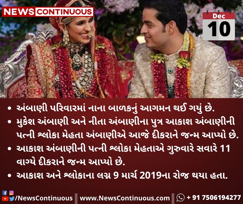 - આકાશ અંબાણીની પત્ની શ્લોકા મેહતાએ ગુરુવારે સવારે 11 વાગ્યે દીકરાને જન્મ આપ્યો છે.