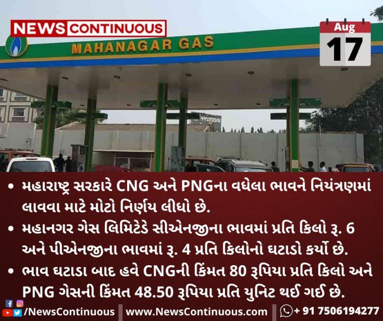 મહાનગર ગેસ લિમિટેડે(Mahanagar Gas Limited) સીએનજીના ભાવમાં(CNG prices) પ્રતિ કિલો રૂ. 6 અને પીએનજીના ભાવમાં(PNG prices) રૂ. 4 પ્રતિ કિલોનો ઘટાડો કર્યો છે.