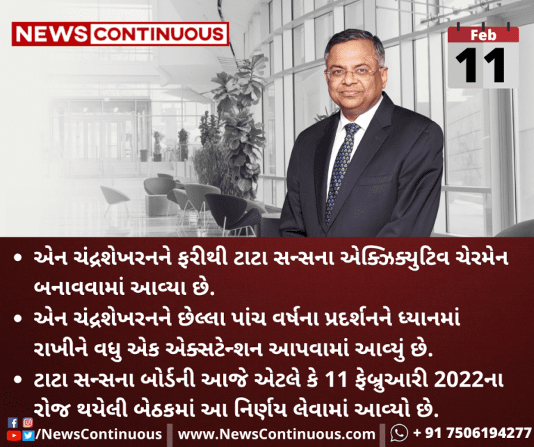 એન ચંદ્રશેખરનને ફરીથી ટાટા સન્સના એક્ઝિક્યુટિવ ચેરમેન બનાવવામાં આવ્યા છે.