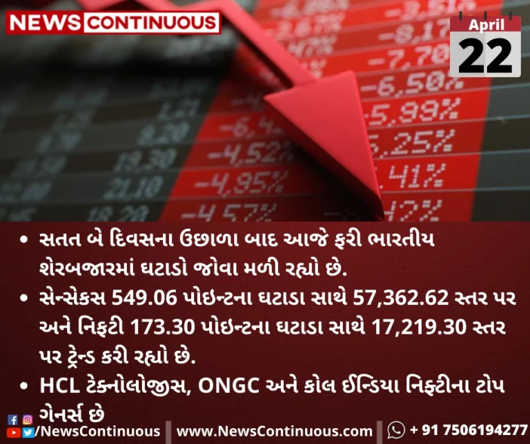 સેન્સેકસ(Sensex) 549.06 પોઇન્ટના ઘટાડા સાથે 57,362.62 સ્તર પર અને નિફટી(Nifty) 173.30 પોઇન્ટના ઘટાડા સાથે 17,219.30 સ્તર પર ટ્રેન્ડ(Trend) કરી રહ્યો છે.