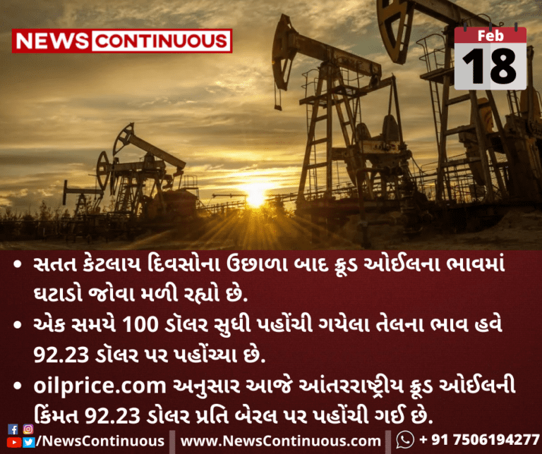 oilprice.com અનુસાર આજે આંતરરાષ્ટ્રીય ક્રૂડ ઓઈલની કિંમત 92.23 ડોલર પ્રતિ બેરલ પર પહોંચી ગઈ છે.