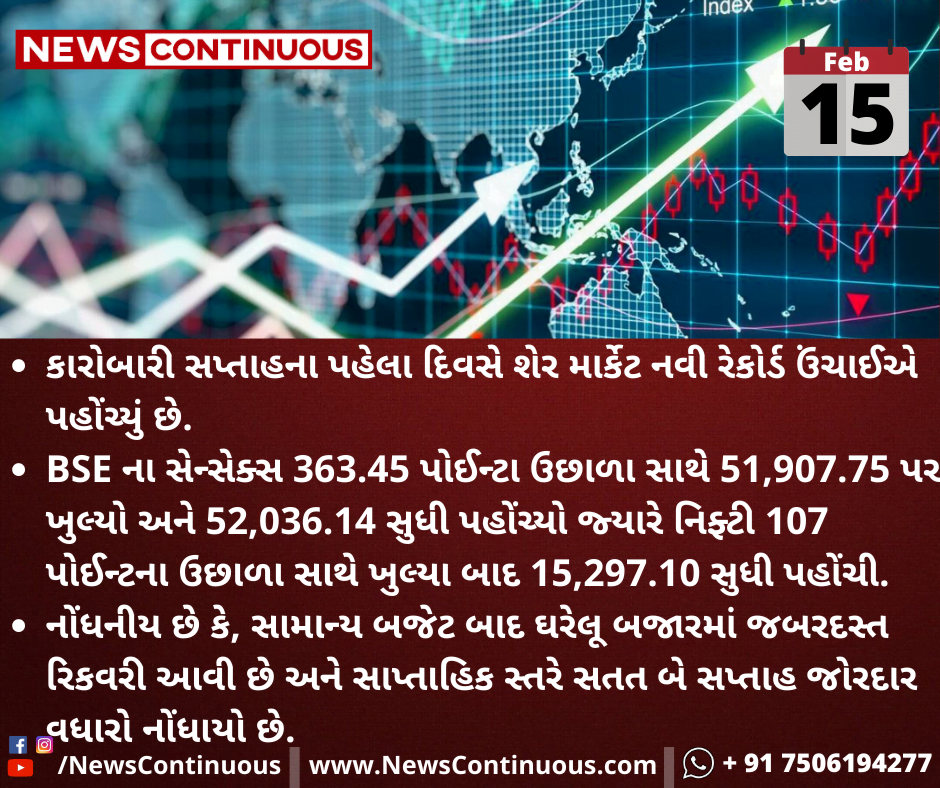 BSE ના સેન્સેક્સ 363.45 પોઈન્ટા ઉછાળા સાથે 51,907.75 પર ખુલ્યો અને 52,036.14 સુધી પહોંચ્યો જ્યારે નિફ્ટી 107 પોઈન્ટના ઉછાળા સાથે ખુલ્યા બાદ 15,297.10 સુધી પહોંચી.
